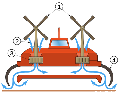 巨大的风扇在气垫船下方吹动空气,通过弹性橡胶 “裙边” 阻止空气的逸出。气垫船下方所产生的高气压能够支撑船体重量,因而使其漂浮在气垫上。巨大的气垫不仅起到支撑船体重量的作用,而且还作为一个软弹簧使船体平稳地漂浮在粗糙的陆地表面或水面上。