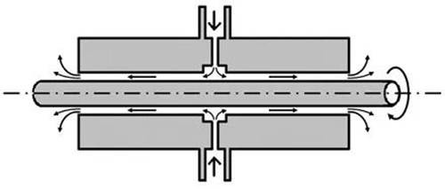 可将同样的原理运用在转轴轴承。将高压空气注入转轴和固定轴承之间的空隙中。该空隙非常小(约为 0.01 毫米),从而使得空隙中的空气压力保持不变。