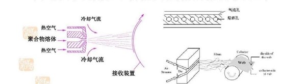 熔喷布的生产工艺便是熔喷非织造工艺,利用高速热空气对模头喷丝孔挤出的聚合物熔体细流进行牵伸,由此形成超细纤维并凝聚在凝网帘或滚筒上,并依靠自身粘合而成为非织造布。