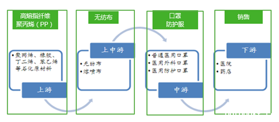 追溯到无纺布的上游,从石油、煤化工企业制得聚丙烯纤维,再让无纺布生产企业进行加工之后得到口罩、防护服等设备。