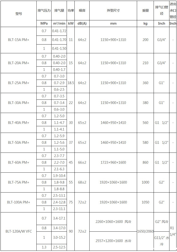 BLT变频系列(11-90kW) l 获益于140余年的历史传承和技术经验。 l 利用欧洲集团公司总部在空气压缩机上的杰出的设计能力和丰富的经验,遵循欧洲集团严格的开发流程及测试标准,针对中国各种复杂气候及恶劣工况进行加强设计,确保每台BLT系列空气压缩机得到最可靠的质量保障。