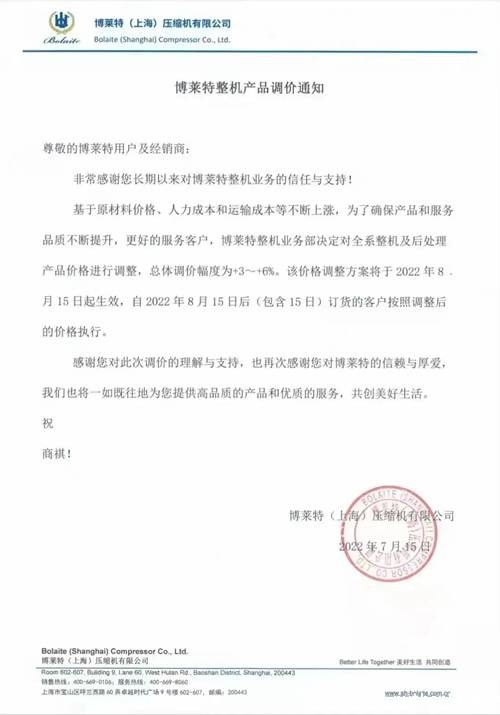 博莱特整机产品调价通知