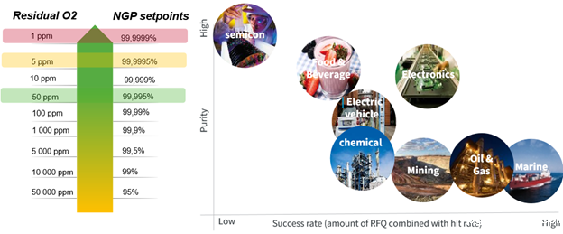基于对中国应用市场的深刻理解,全新NGP制氮机的目标行业是食品、饮料、电子、石化、制药、金属等行业。这些行业对制氮机的要求非常严格,需要能够提供稳定氮气并满足99.5%到99.999%纯度要求,这次发布的NGP就是优异制氮机品牌为客户生产保驾护航。