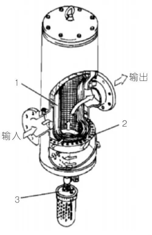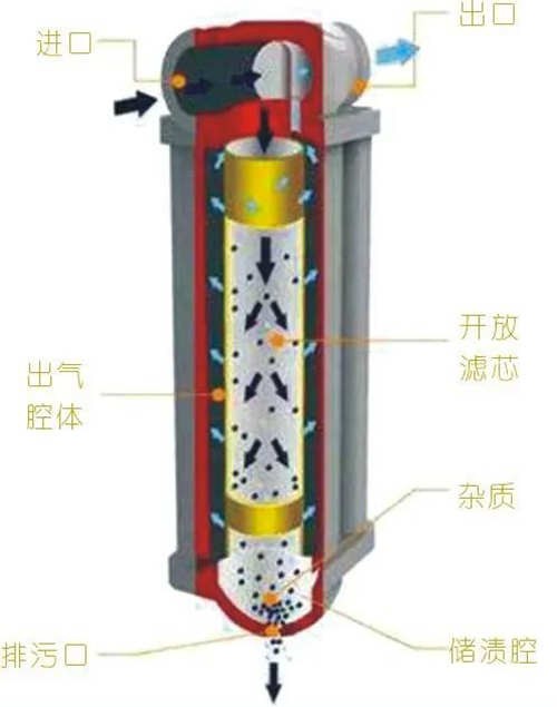 为了适应高负荷的工作特点,这类过滤器大多采用两级过滤方式,即压缩空气进入过滤器后,先遭遇能产生惯性分离作用的装置,在机械力(离心、碰撞等)作用下使空气中较大粒径的灰尘、水滴与空气分离,然后流入憎水处理过的蓬松型纤维主过滤层,继续除去空气中剩余的较小粒径的杂质。