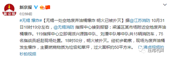 19时50分左右,无锡消防发布消息确认,梁溪区某市场附近空地废弃油桶发生爆炸。经初步勘察,主要燃烧物质为垃圾和草坪,过火面积约50平方米。