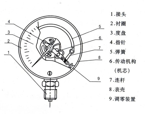 不锈钢压力表由导压系统(包括接头、弹簧管、限流螺钉等)、齿轮传动机构、示数装置(指针与刻度盘)和外壳(包括表壳、表盖、表玻璃等)所组成。外壳为气密型结构,能有效地保护内部机件免受环境影响和污秽侵入。对于在外壳内充液(一般为硅油或甘油)的仪表,能够抗工作环境振动较剧和减少介质压力的脉动影响,如下图示: