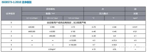 油:压缩空气中的油含量包括液体和蒸汽形式的油。这一类别至关重要,因为油污染会降低产品质量,损坏设备,并构成健康风险。该标准规定了基于油(包括油气溶胶、蒸汽和液体)浓度的等级,以毫克/立方米为单位进行测量。例如,0级代表油含量最低的最高纯度水平,这对制药和食品加工等行业至关重要,在这些行业中,即使是微量的油也可能是不可接受的。