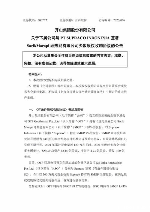 开山股份(300257.SZ)公告称,公司下属公司OTP Geothermal Pte., Ltd.和KS Orka Renewable s Pte. Ltd.与PT Supraco Indonesia签署《有条件股权收购协议》,合计以300万美元现金收购Supraco持有的SMGP股份。交易完成后,OTP和KSO将分别持有SMGP 98.57%和1.43%的股份,公司将持有SMGP 100%的股份。