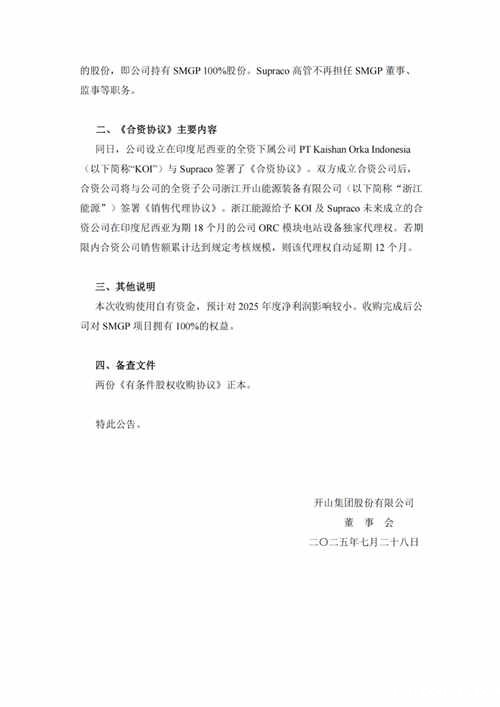 同日,公司下属公司KOI与Supraco签署了《合资协议》,双方将成立合资公司。合资公司将与公司的全资子公司浙江开山能源装备有限公司签署《销售代理协议》。浙江能源给予KOI及Supraco未来成立的合资公司在印度尼西亚为期18个月的公司ORC模块电站设备独家代理权。