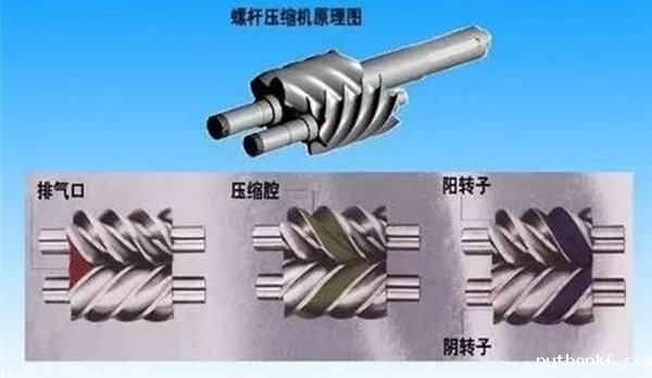 螺杆式空气压缩机的工作容积是由一对相互平行放置且相互啮合的转子的齿槽与包容这一对转子的机壳所组成。在机器运转时二转子的齿互相插入对方齿槽,且随着转子的旋转插入对方齿槽的齿向排气端移动,使被对方齿所封闭的容积逐步缩小,压力逐渐提高,直至达到所要求的压力时,此齿槽方与排气口相通,实现了排气。