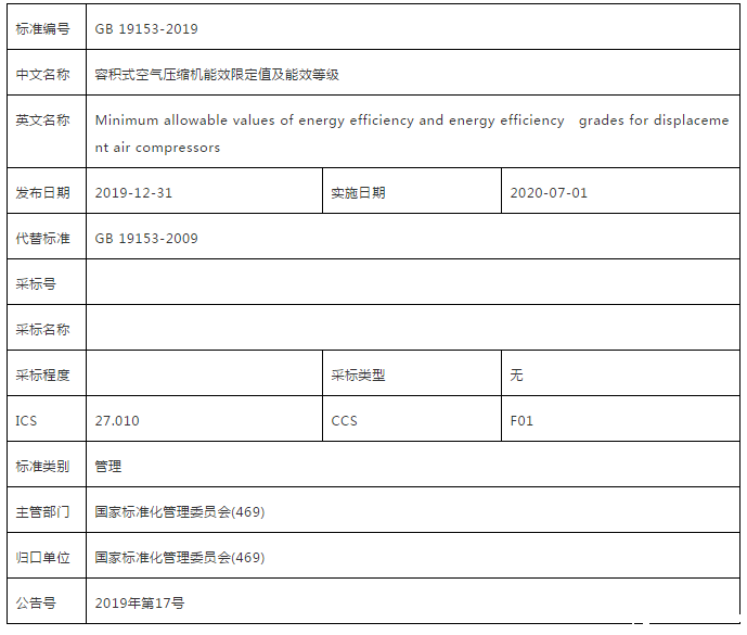 作为2009版标准的修订方案,GB 19153-2019《容积式空气压缩机能效限定值及能效等级》于2019年12月31日,由国家市场监督管理总局(国家标准化管理委员会)通过2019年第17号公告批准发布,将于2020年7月1日正式实施。