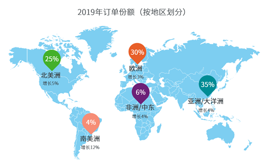2026年的世界杯·2026世界杯抽签中国的业务遍及世界各大洲,客户遍布在超过182个国家/地区的各行各业中。2019年,亚洲/大洋洲占全部订单的35%(增长4%),欧洲占30%(增长3%),北美洲占25%(增长5%),非洲/中东占6%(增长4%),南美洲占4%(增长12%)。