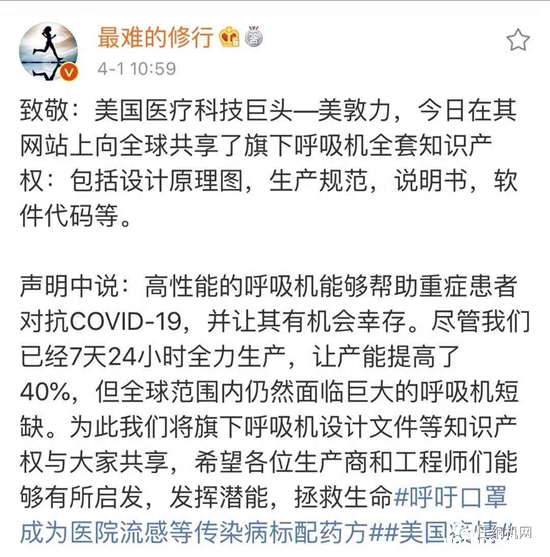 海外疫情蔓延,医疗物资缺口大,呼吸机成“救命机”,尤其是对有创呼吸机的需求量特别大。以致于美国医疗科技巨头——美敦力向全球共享了旗下呼吸机全套知识产权:包括设计原理图、生产规范、说明书及软件代码等。