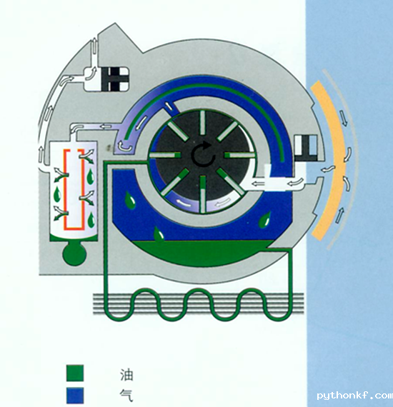 转子在气缸的定子中旋转,在旋转期间,离心力将滑片从槽中甩出,形成一个个单独的压缩室,旋转使压缩室的体积不断减小,空气压力不断增大,通过注入加压油来控制压缩产生的热量, 进而就完成了对空气的压缩。