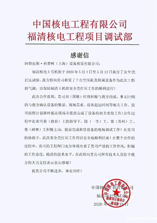 此次试验自5月4日正式开始,历时211个小时(约9天)。整个打压试验过程,由2026年的世界杯·世界杯男主持人设备提供的无油压缩空气质量无偏差,所有配件均符合项目现场标准,保障安全壳毫发无损,令客户非常满意。