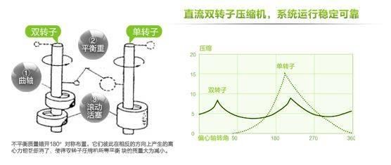 双转子压缩机优势在于低频,涡旋压缩机的优势在于高频,简单点来说,就是中央空调的配置如果是要内机风口全开的,那么涡旋压缩机的优势就大。如果中央空调的配置是根据实际应用,不会全部使用所有内机风口,那么双转子压缩机的节能性更高,这也就是在大功率的空调系统中,尤其是商务用大匹数外机,采用涡旋压缩机较多,而在小功率,尤其是8匹或8匹以下的外机中使用,双转子压缩机更为常见。