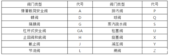 阀门类型代号用汉语拼音字母表示,按表l 的规定表示。