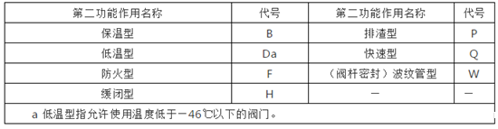 当阀门还具有其他功能作用或带有其他特异结构时,在阀门类型代号前再加注一个汉语拼音字母,按表2 的规定。