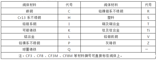隔膜阀以阀体表面材料代号表示。阀门密封副材料均为阀门的本体材料时,密封面材料代号用“W”表示。