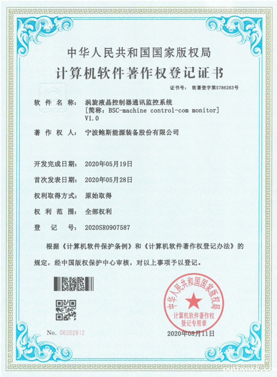 近日,鲍斯又喜获一项“壳体自带冷却结构的无油螺杆一体机”实用新型专利证书、“压缩机(涡旋式)”、“压缩机”两项外观设计专利证书以及“涡旋液晶控制器通讯监控系统”计算机软件著作登记权证书。