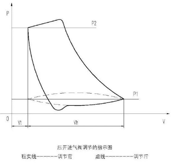 由于卸荷阀是运动件,总体调节可靠性有所降低。对于无润滑压缩机,要特别考虑卸荷器内运动件必须是无油润滑,特别是一些易燃易爆气体介质的特种压缩机。总的来说采用卸荷器调节排气量,其指示功为克服全开进气阀阻力所消耗的功,所以经济性较高。利用卸荷器压开进气阀调节的指示图如下: