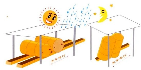 油桶尽量横放,使其两个桶塞在同一水平线上,油桶的两侧用木楔固定,防止其滚动。横放油桶水分不会聚集在桶面边沿从而进入桶内,且桶塞内侧会完全浸泡在润滑油内,避免空气通过桶塞进入桶内,从而对润滑油造成一定污染。如若必须竖放时,应将桶倒置,使桶盖朝下。当油桶必须以桶塞朝上的方向摆放时,应该用木条垫起油桶的一边使底部向一侧倾斜,两个桶塞连起的直线要与木条平行,使积水远离桶塞的开口处。