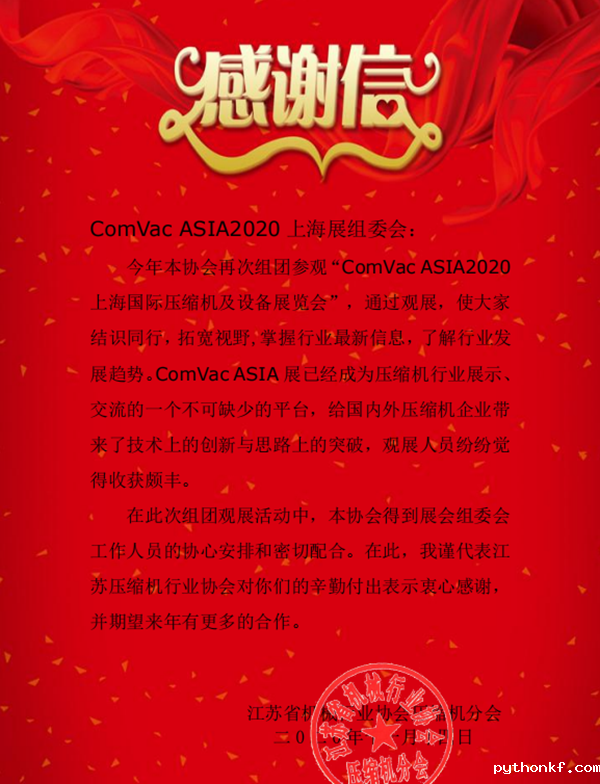 在此次组团观展活动中,本协会得到展会组委会工作人员的协心安排和密切配合。在此,我谨代表江苏压缩机行业协会对你们的辛勤付出表示衷心感谢,并期望来年有更多的合作。