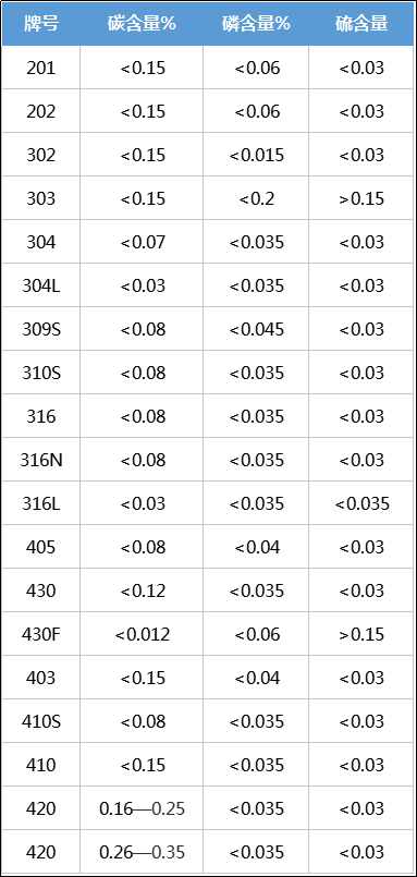 304L:是碳含量较低的304不锈钢的变种,用于需要焊接的场合。较低的碳含量使得在靠近焊缝的热影响区中所析出的碳化物减至最少,而碳化物的析出可能导致不锈钢在某些环境中产生晶间腐蚀(焊接侵蚀)。