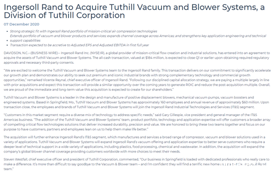 "我们很高兴欢迎泰悉尔真空和鼓风机业务团队加入英格索兰公司的大家庭。这项交易实现了我们大幅加快增长计划的承诺,并证明了我们寻找具有强大互补技术和商业增长机会的优质标志性工业品牌的能力,"英格索兰首席执行官Vicente Reynal表示。"按照公司严谨的资本配置策略,我们支付的倍数与之前的收购基本一致,并预计此次交易将在未来几年提供类似的机会,以产生投资回报率并降低收购后的倍数。总之,我们对此次收购有望为我们的股东创造短期和长期价值而感到自豪。"