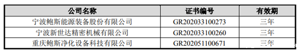 根据高新技术企业认定管理工作网发布的《关于宁波市 2020 年第一批高新 技术企业备案的复函》(国科火字【2020】245 号)和《关于重庆市 2020 年第 一批高新技术企业备案的复函》(国科火字【2020】226 号),宁波鲍斯能源装备股份有限公司、公司全资子公司宁波新世达精密机械有限公司、公司控股子公司重庆鲍斯净化设备科技有限公司均重新通过高新技术企业认定。
