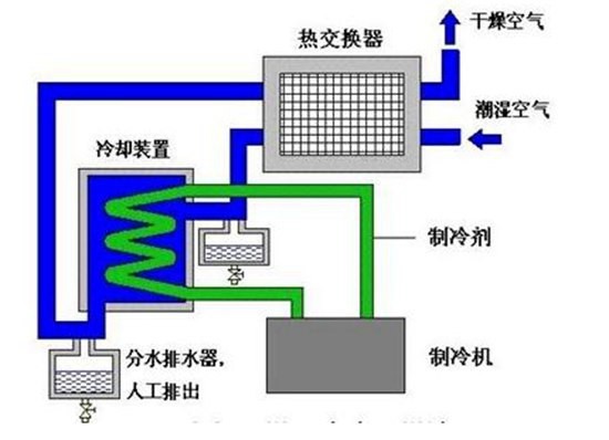 空气干燥机主要原理是被压缩的空气从空压机进入干燥机,与制冷系统的蒸发器进行热交换,压缩空气中的水蒸气冷凝成液态水,经分离器排出,成品气从干燥机的出口排出。蓄能液强化热交换,一方面调节部分负荷时的能量消耗,为了节省能源,对于处理量较大的冷干机,压缩空气先进入一个“空气---换空气”换热器。