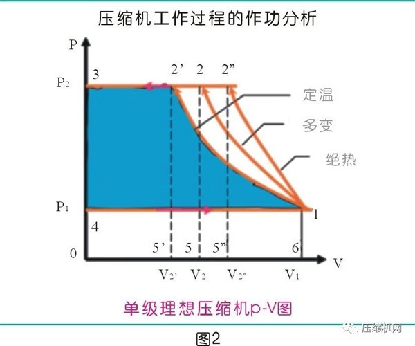 图1的2-1过程就是空压机压缩的过程,通常分为:等温压缩(温度不变)、绝热压缩(与周围没有热交换)、 多变压缩(与周围产生热交换)。
