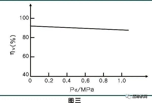 同样排气压力为7bar,单级压缩主机压比为8:1;两级压缩主机头压比为2.8:1。从容积效率来看,压比增大,绝热效率值下降。(见图4)