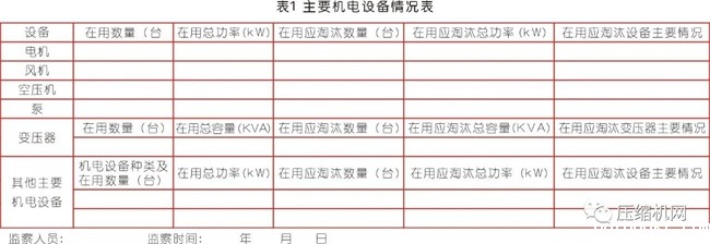 其中,《钢铁行业能耗专项监察工作手册》、《水泥行业能耗专项监察工作手册》、《电解铝行业能耗专项监察工作手册》均要求查阅企业主要用能设备台账,核实型号、数量、生产时间、安装位置、功率、运行状态等数据,现场查验与设备台账的一致性。根据《高耗能落后机电设备(产品)淘汰目录》(第一至四批)、《关于组织实施电机能效提升计划(2013-2015 年)的通知》(工信部联节〔2013〕226号)、《变压器能效提升计划(2021-2023年)》(工信厅联节〔2020〕69号)规定,确定在用电动机、风机、空压机、水泵、锅炉和变压器等用能设备属于淘汰类的明细清单(见表1)。