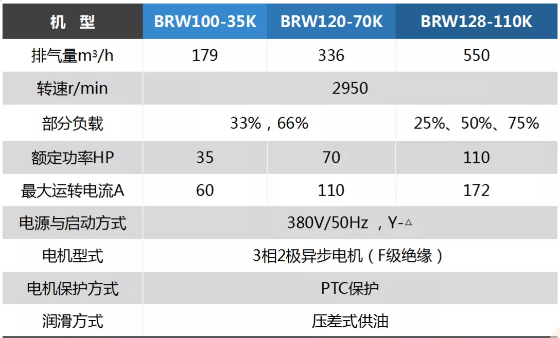 BRW-K全系列压缩机均使用容量调节机构,根据客户需求分级调节排气量。启动时亦部分负载启动,降低对电网的冲击。