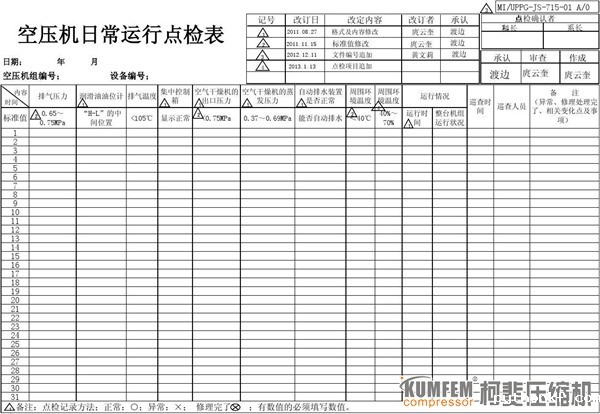 空压机的日常巡检是非常重要的,日常巡检过程中能够实时了解空压机的运行情况和发现空压机存在的问题。那么一张合格的空压机日常运行检点表,应该有哪些方面呢?