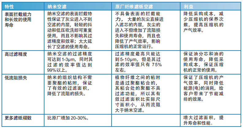 博莱特全新推出的纳米空滤,不但不能阻止小颗粒(1-3μm)的灰尘进入压缩空气系统,而且降低了气体通过时的流阻,其表面拦截颗粒的能力也保证了其反复吹洗的能力,大大提高了压缩机的产气效率的同时也保证了空气压缩机的其他易损件的使用寿命。其性能大大超越原厂的普通纤维滤纸空滤。